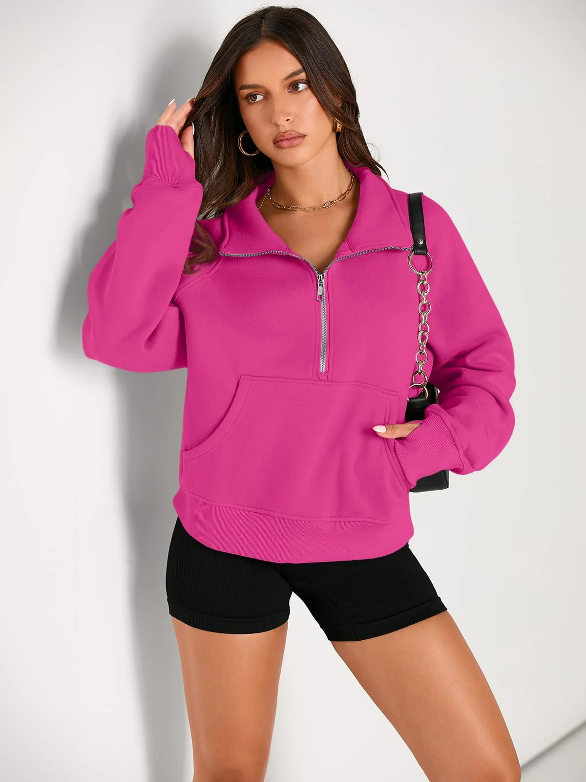Womens Sweatshirts Half Zip Cropped Pullover Fleece Outfits Clothes – Hotpink